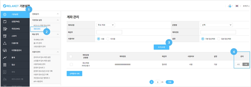 이미 생성된 계좌의 내용 수정 뿐만 아니라 용도에 따라 계좌 리스트 추가 및 삭제도 가능합니다.