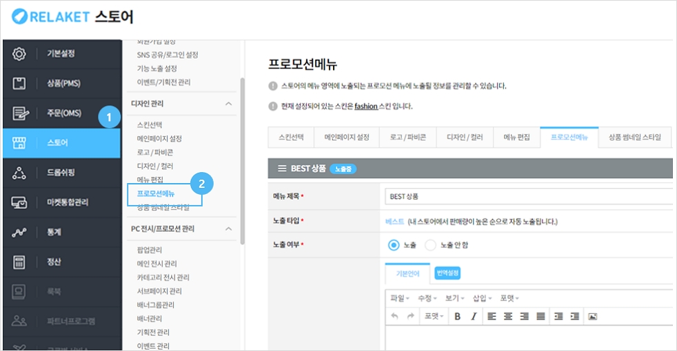 프로모션 메뉴 관리는 마이 오피스 > 스토어 > 디자인 관리 > 서비스 > 레이아웃 관리를 통해 설정이 가능합니다.