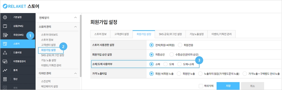 회원가입 시 설정했던 소매/도매 사용여부는 마이 오피스 > 스토어 > 스토어 관리 > 회원가입 설정에서 수정이 가능합니다.