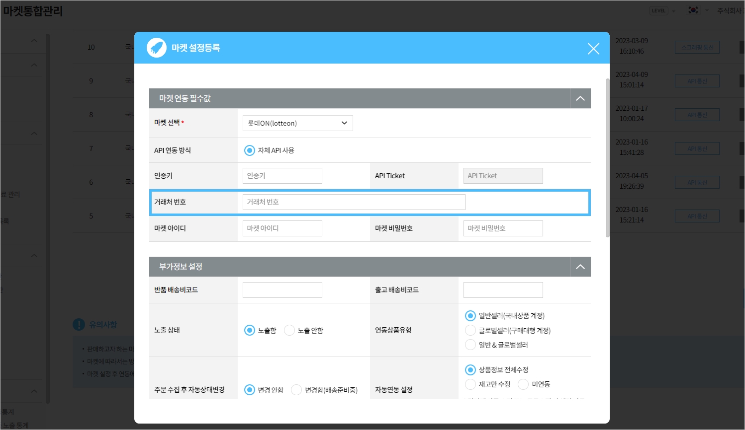 롯데온 마켓연동 실패 메세지에 [상위거래처코드/번호] 입력하라 확인되는데, 어떻게 해야하나...