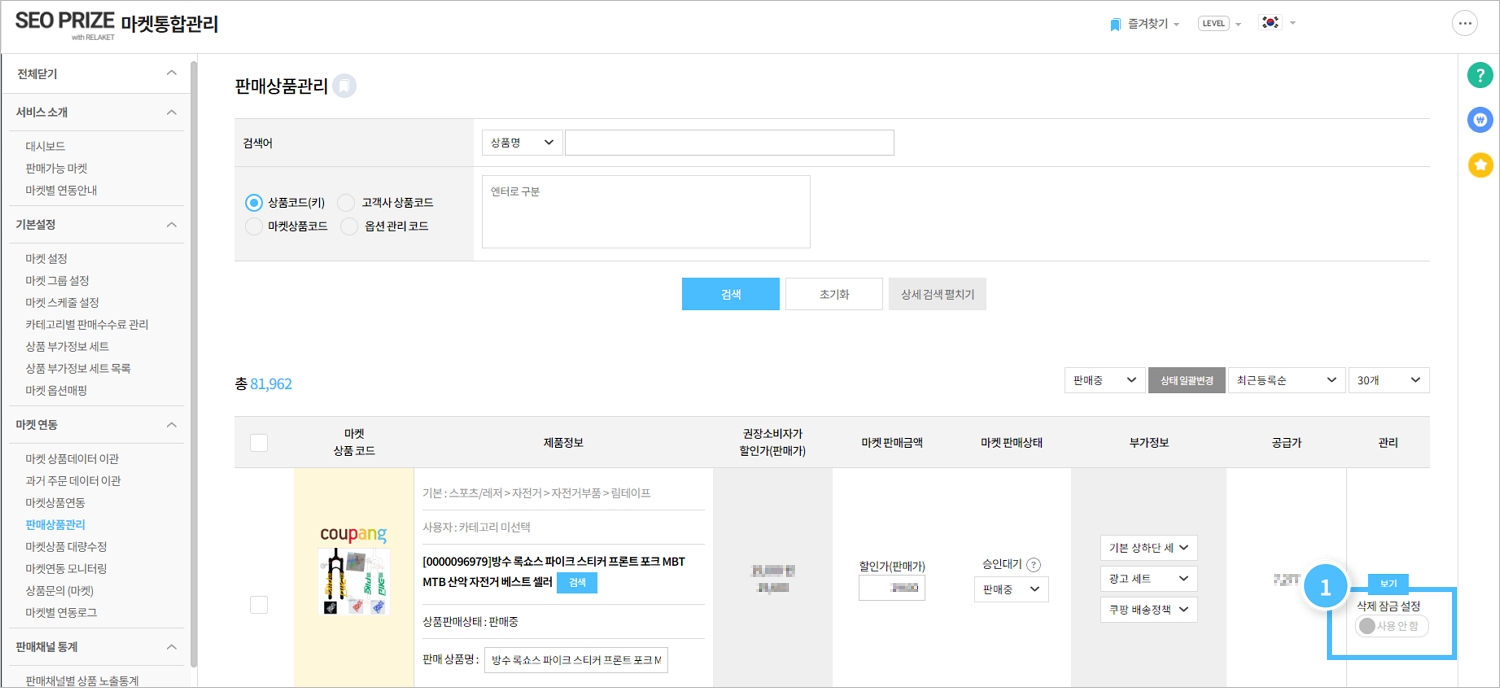 2. [마켓통합관리 > 마켓 연동 > 마켓상품연동] 메뉴에서 확인되는 [상품 삭제잠금]은 상품리스트 삭제 잠금